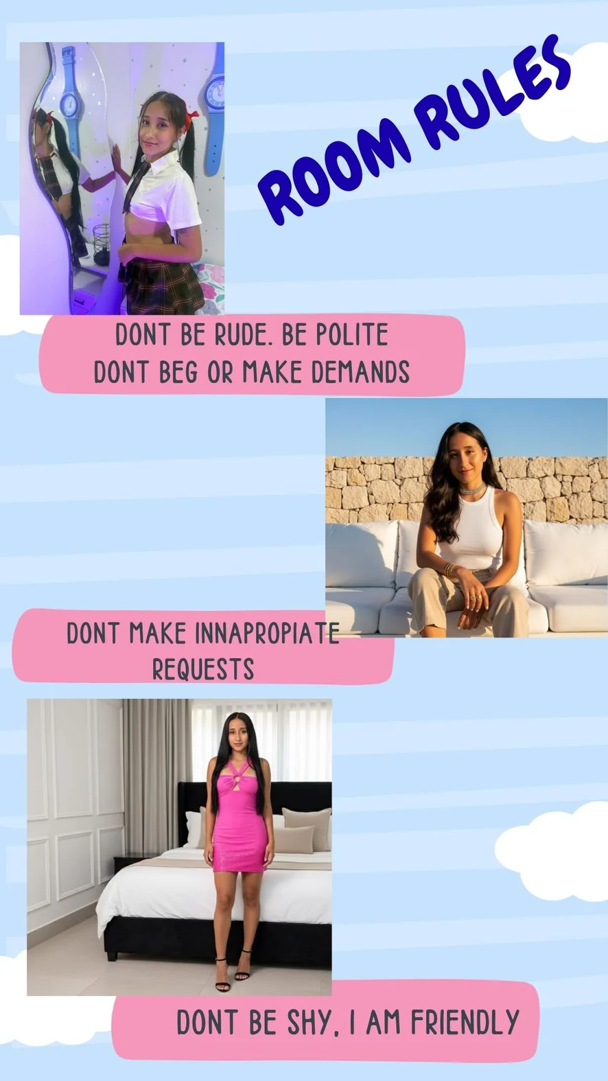Pseća poza, Ahegao, Spanking, Erotski ples, Camel Toe, Striptiz, Pokazivanje, Ispod suknje, Twerk, Toples, Prstenjanje, Dildo ili vibrator, Upute za drkanje, Seks Igračke, Pušenje, Masturbacija, Drkanje, Lizanje stopala, Kaubojka, Potpetice, Tittyfuck, Squirt, Show s uljem, Hardcore, Orgazam, Gagging, Igračke za bradavice, Duboko grlo, Fetiš stopala, Igra uloga